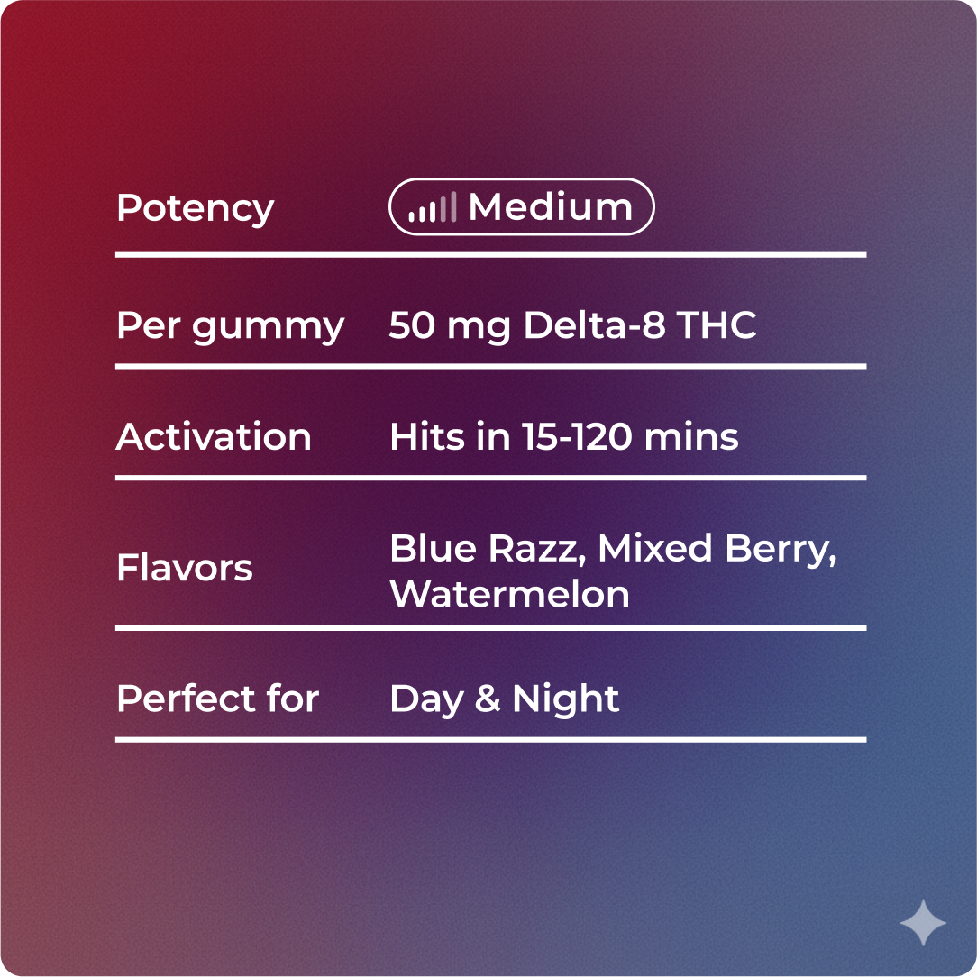 Perfect for experienced users craving deep relaxation, a lifted mood, and a potent edible ride that hits just right every time.
