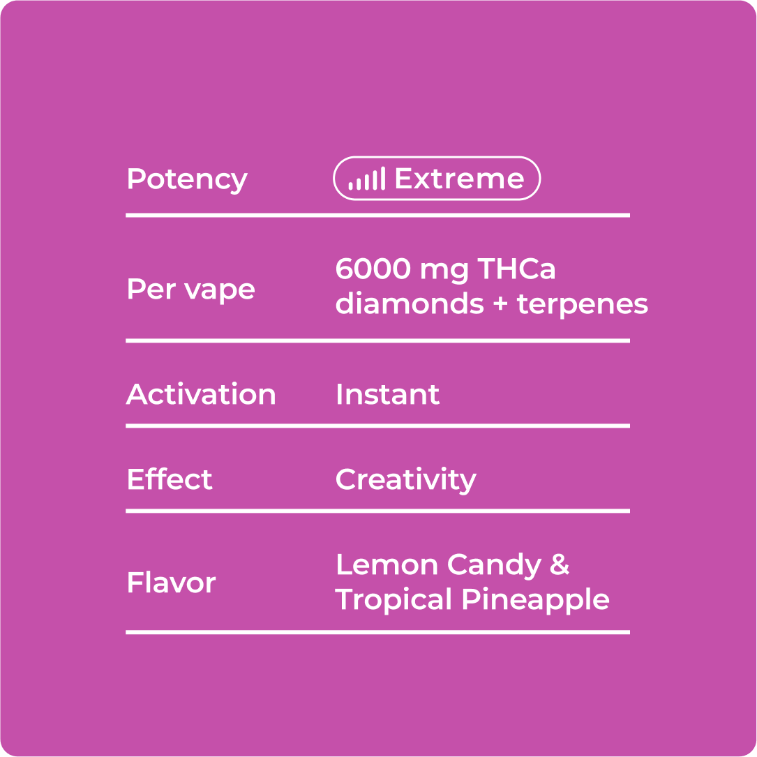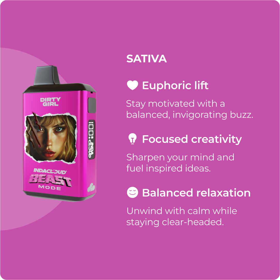 Lemon-pine electricity meets total knockout THCA diamonds, Dirty Girl Beast Mode ignites high-energy creativity and sharp euphoria in a sleek 6g disposable.