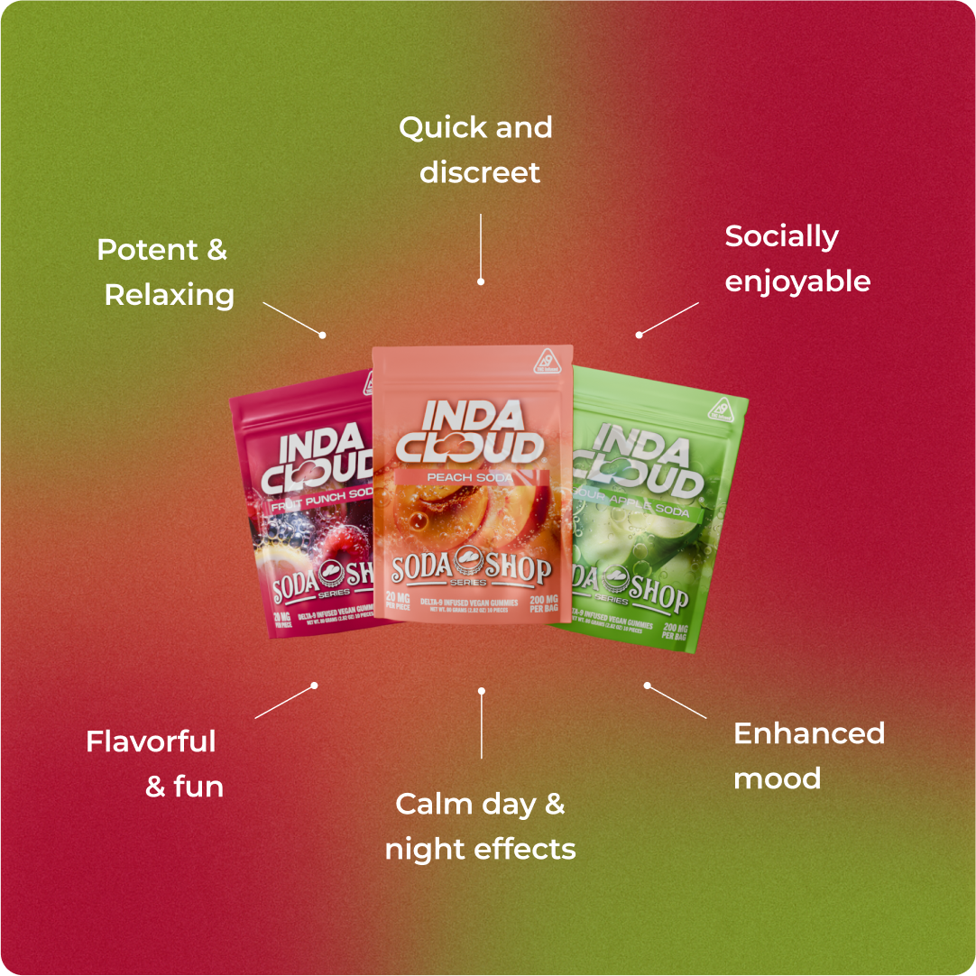 Indacloud gummies, including our Soda Shop, Delta 8, and Sleep Bliss series are all vegan. We use fruit pectin instead of traditional gelatin to form our gummies, giving them an amazing texture and making them free of any animal products.